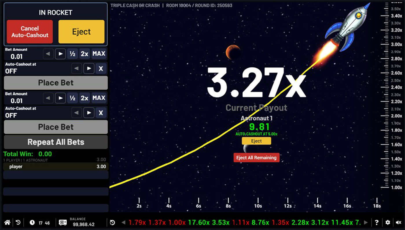 TRIPLE CASH OR CRASH met en scène un trio de courageux astronautes qui s'envolent dans l'espace avec votre mise. Leur mission? S'envoler de plus en plus haut, car le multiplicateur leur fait gagner de plus en plus d'argent à chaque milliseconde ! Cependant, vous devez garder un œil sur leur intuition et éjecter les astronautes en toute sécurité de la fusée avant qu'elle n'EXPLOSE avec vos gains. Plus ils volent haut, plus vos paris sont multipliés!